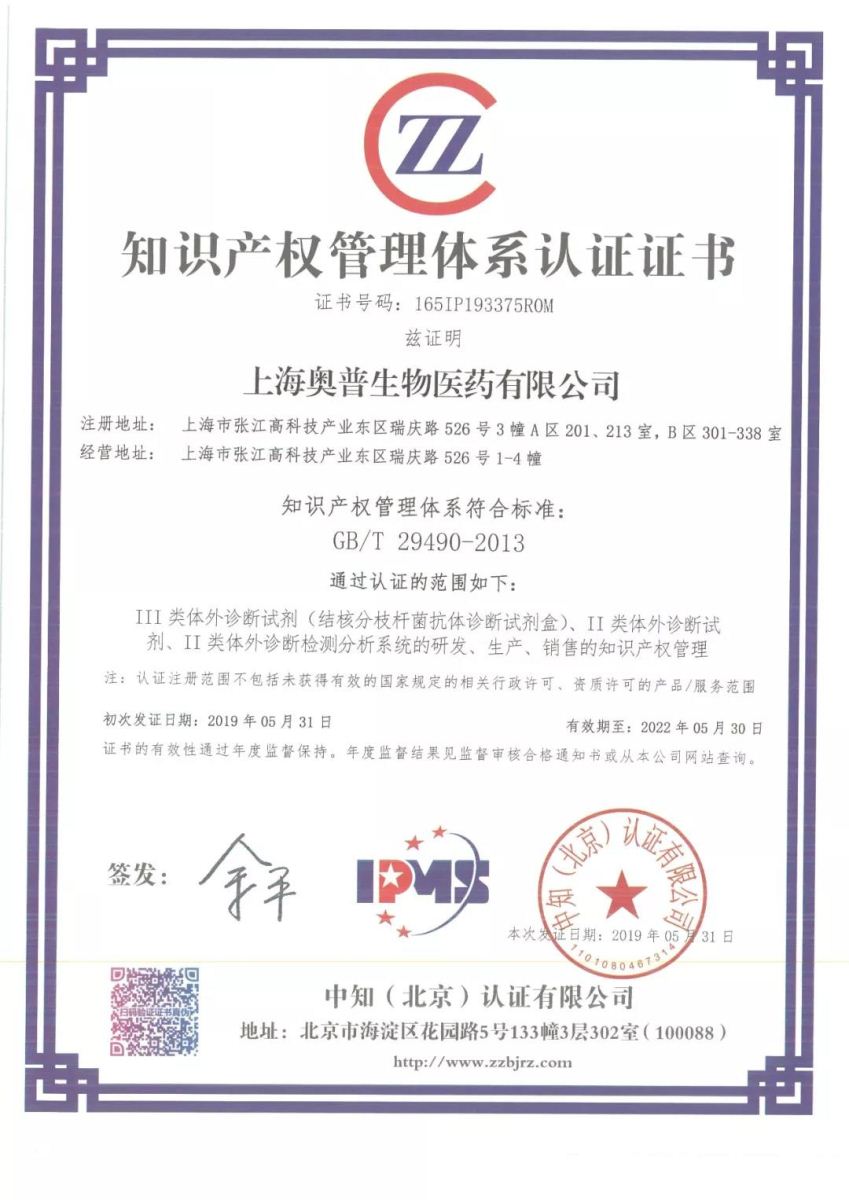 知识产权将成为企业防御和竞争最有效的武器,如何为公司知识产权竞争时代的来临做准备,显然,贯标是最适合的选择!奥普生物于2019年5月完成贯标工作,并取得知识产权管理体系认证证书。自知识产权体系实施运行以来,知识产权管理意识逐步深入到公司研发、生产、销售、采购等各个环节,知识产权规范化成为公司工作的常态。体系的建设将推动公司在知识产权创造、运用和保护等方面进一步探索,助力提升公司创新能力,增强公司在国内外IVD领域的核心竞争力,从而打造中国医学诊断企业品牌,为服务上海战略与国家战略作出更大贡献。