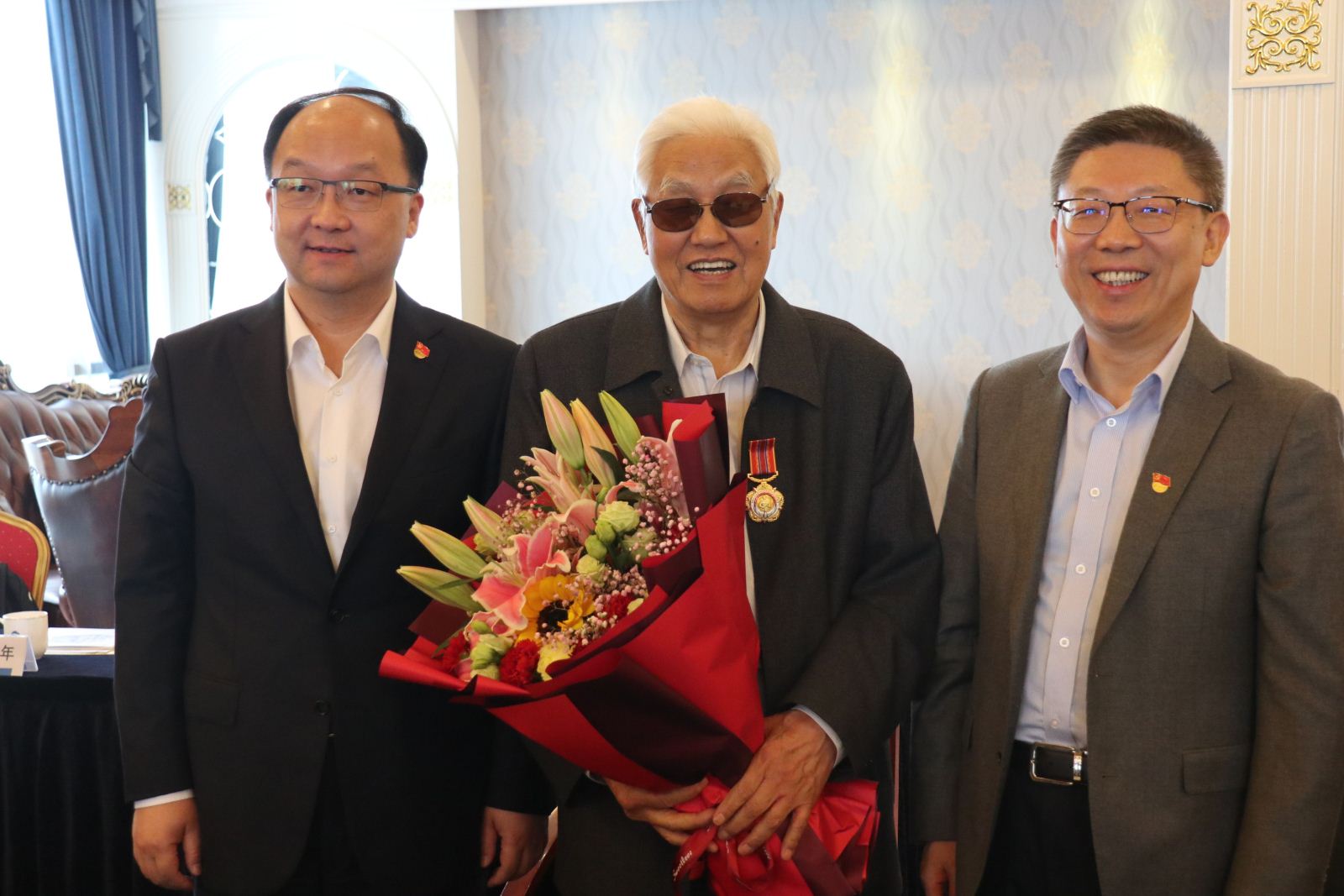 时值抗美援朝胜利70周年庆,活动现场,程巍与朱兆开为上海电气离退休老干部、抗美援朝志愿军老战士赵洪法书记转增了“抗美援朝70周年纪念奖章”,表达了衷心的感谢和祝福。