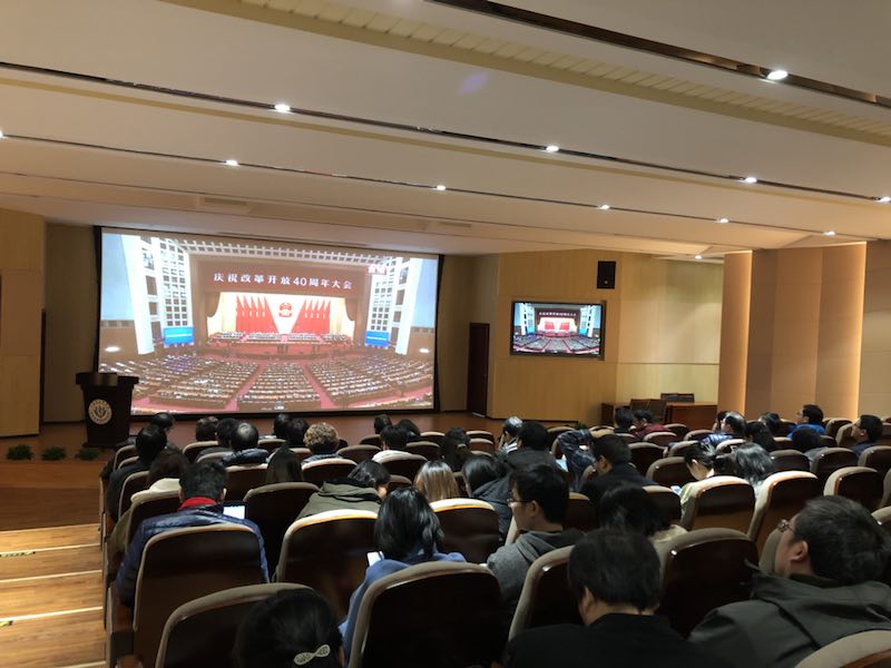 12月18日,庆祝改革开放四十周年大会在北京人民大会堂隆重举行。中共中央总书记、国家主席、中央军委主席习近平出席大会并发表重要讲话。校党委统一部署,校党委理论学习中心组在200人报告厅集中观看大会盛况并组织学习讨论。学校各党总支、直属党支部组织师生收看大会现场直播。
