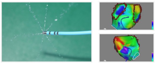 FireMagic®冷盐水灌注射频消融导管内部多传感器的设计,实现了Columbus®系统对导管可弯段图像的实时显示,医生可更加直观地感知和判断体内导管的状态。此外,FireMagic®冷盐水灌注射频消融导管内设开放式盐水灌注管路,并与头电极上的灌注孔相连,在射频消融期间,通过灌注生理盐水对消融电极进行主动冷却,并且头端电极温度始终保持较低,可有效减少结痂风险,因而较传统消融导管更为有效、安全。
