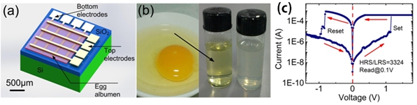 (a)基于鸡蛋清的可降解忆阻器三维结构图;(b)蛋清和蛋清稀释液;(d)器件电测试结果。
